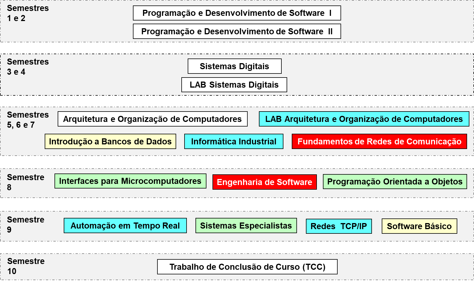 Visto que algumas disciplinas requerem conhecimentos obtidos em outras, uma sequência planejada de forma apropriada é importante pois facilita o aprendizado e permite melhores resultados. A figura a seguir apresenta uma referência da sequência de disciplinas a cursar, neste cenário de Automação Industrial. ![]() Legenda: ![]() |